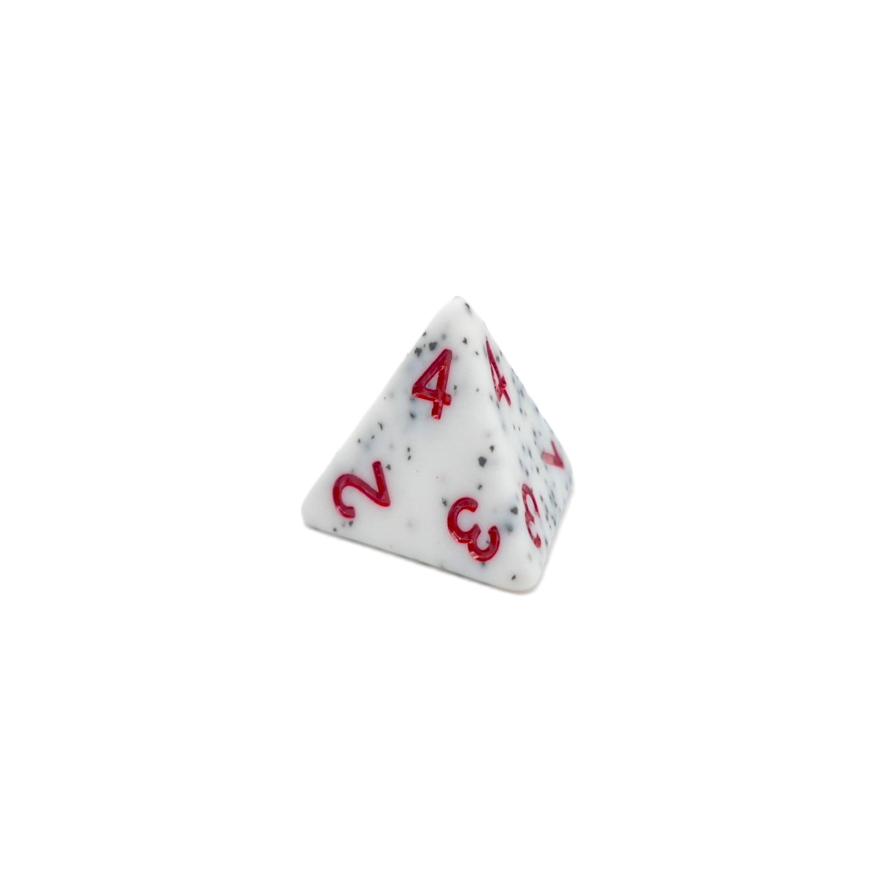 White dice with black speckles and red numbers.