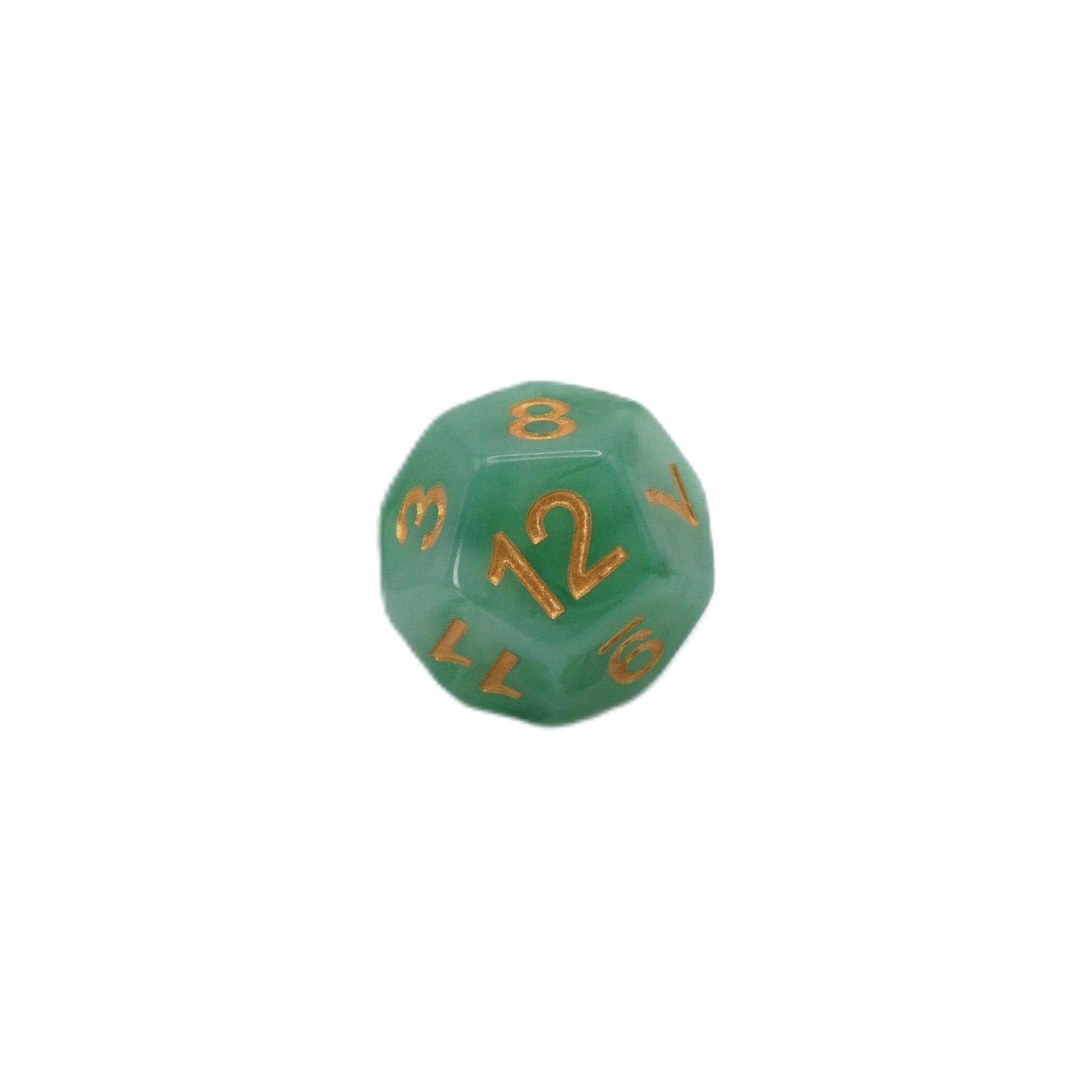 Swirled green dice with gold numbers.