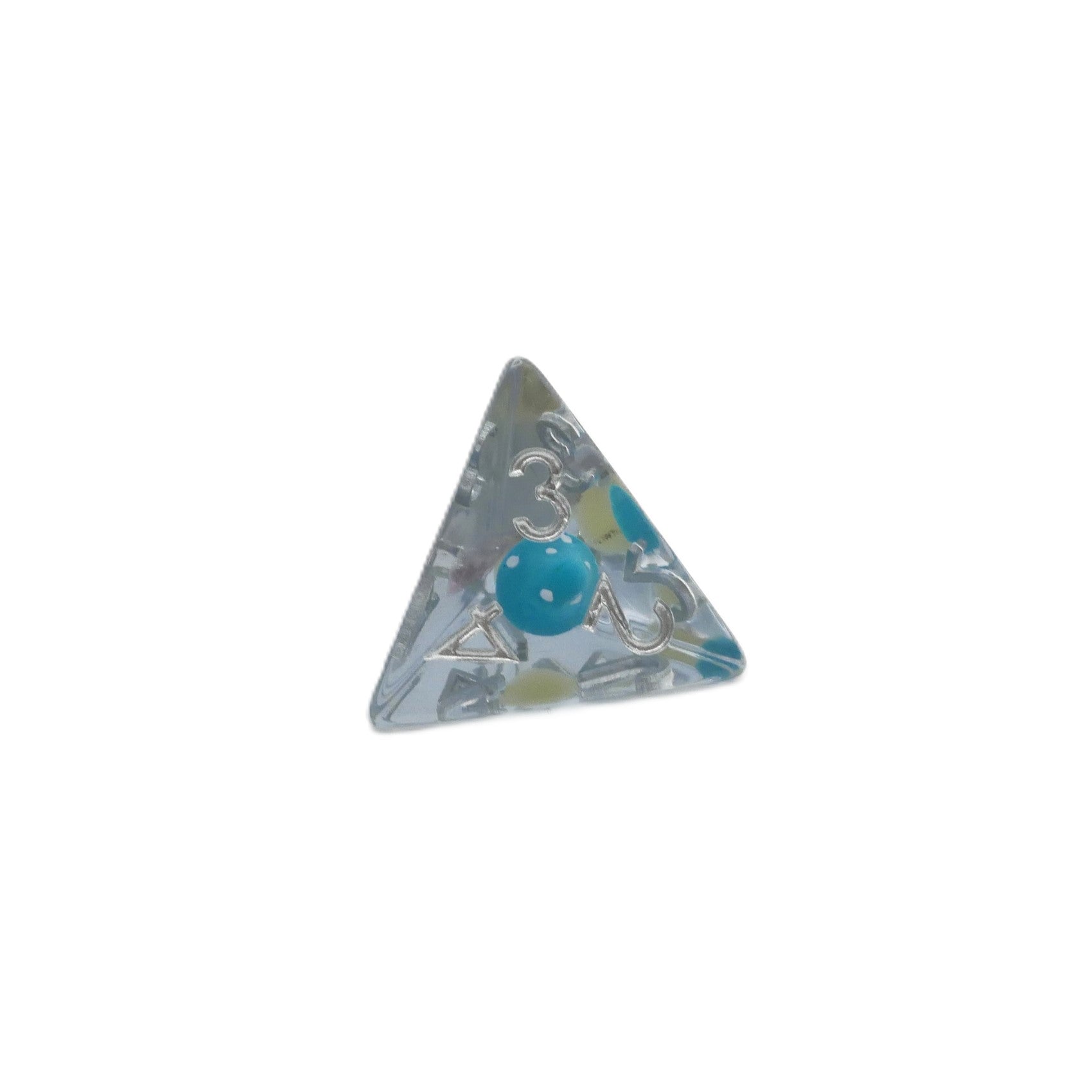 Multi-colored mini mushrooms in clear blue dice with silver numbers.
